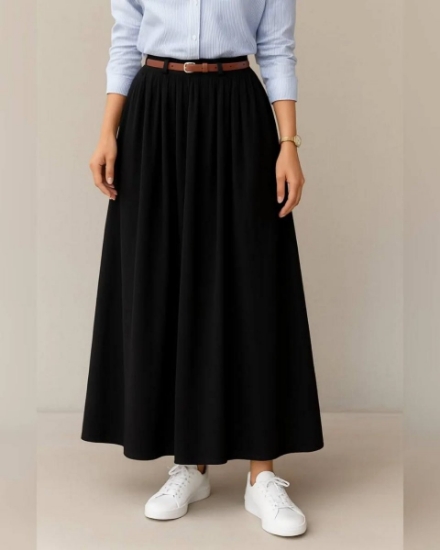 ♻️مدل دامن : مهلا♻️جنس :لینن با کیفیت عالی♻️رنگبندی: مشکی. کرم. قهوهای وسورمه ای♻️سایز 1مناسب 38الی 42♻️سایز 2مناسب44الی48♻️پشت کار برای استایل بهتر کش خورده( کمر)♻️قددامن حدود95