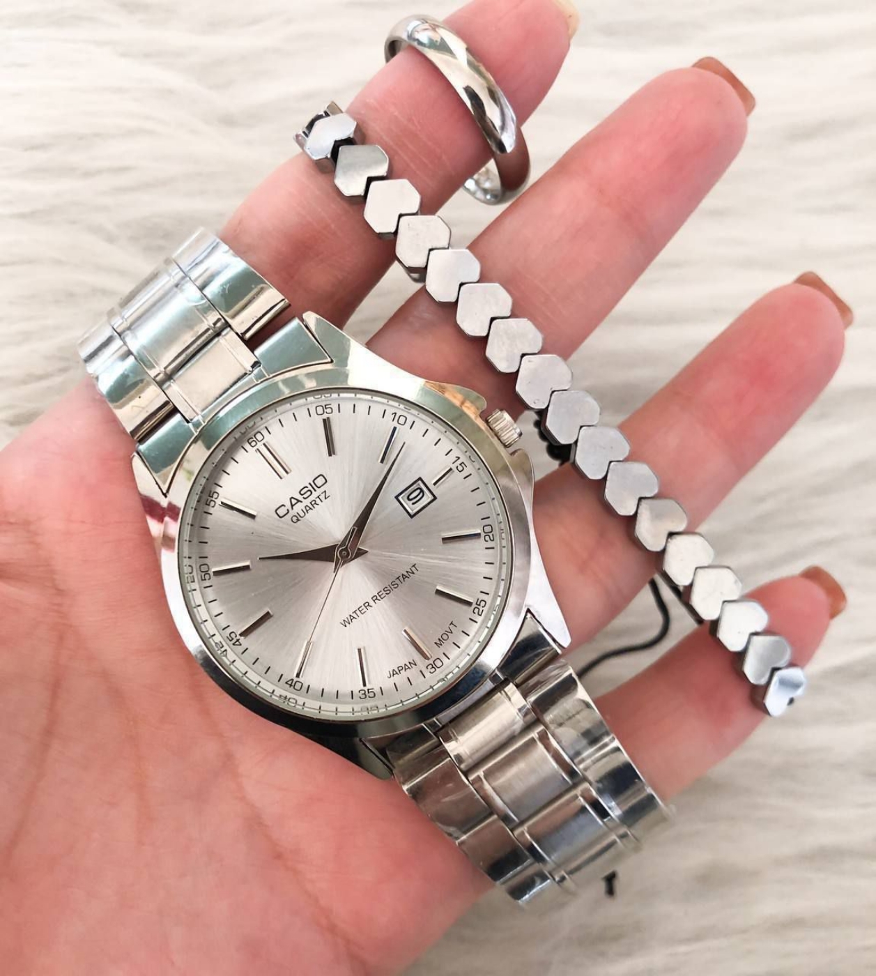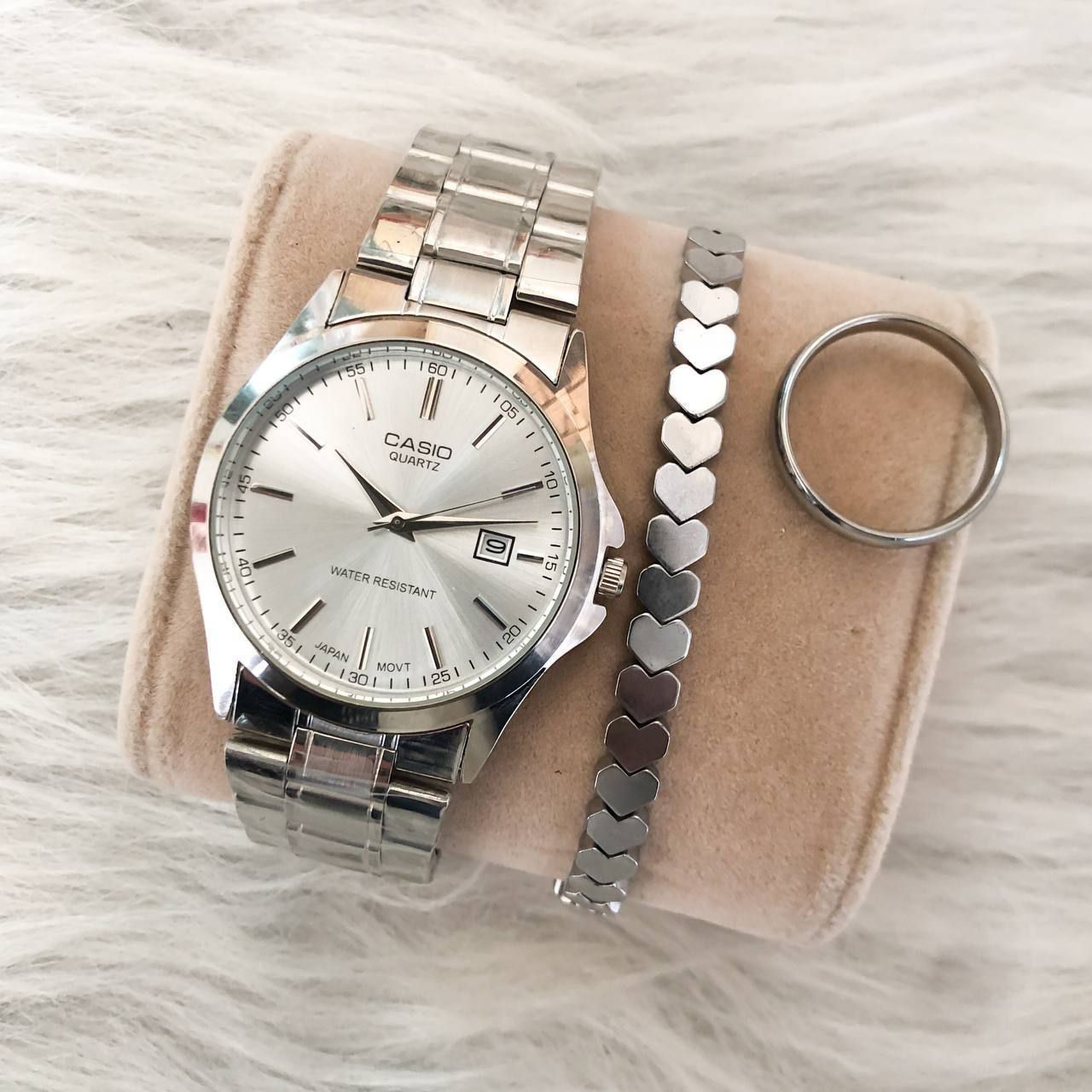 369010 – ست #ساعت مردانه #کاسیو، بند استیل نقره‌ای، صفحه نقره‌ای 🎁 کیفیت عالی – مناسب هدیه و جشن تولد ✔️ دارای تقویم + 6 ماه گارانتی موتور ✔️ ارسال با جعبه کادویی مخصوص ساعت + کارت ضمانت ✔️ همراه با دستبند حدید نقره‌ای و حلقه نقره‌ای ✔️ جعبه کادویی + کارت گارانتی ✔️ قطر شیشه ساعت مردانه: 34 میلی‌متر