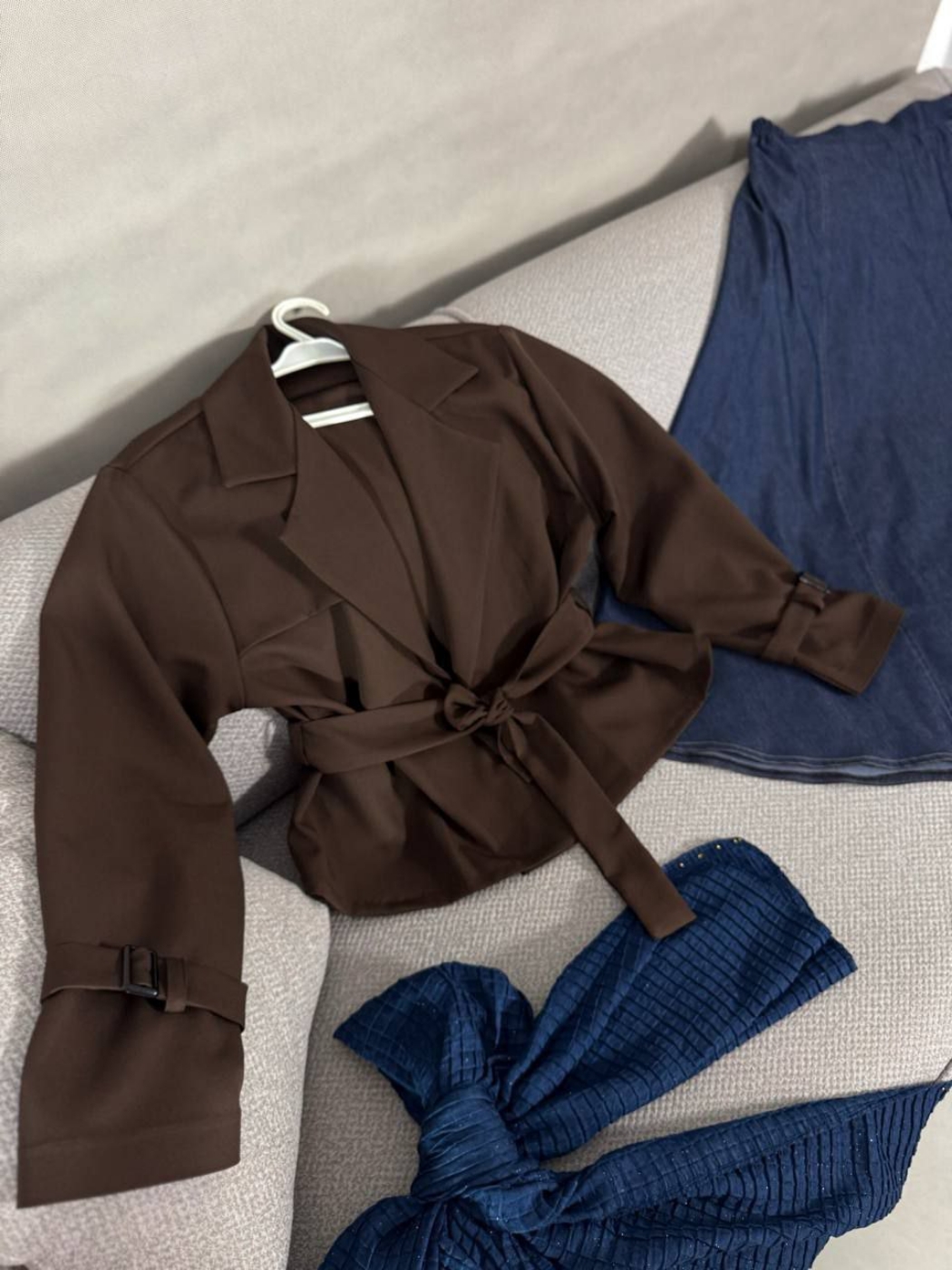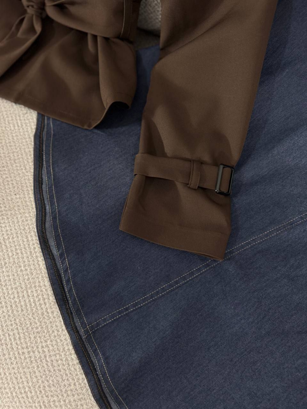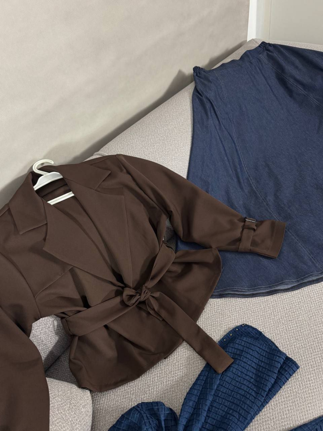 🧵جنس : جنس کت کرپ سوپر باربی درجه یک رنگ قهوه ای سوخته ترندی ،دامن جین پنبه درجه یک