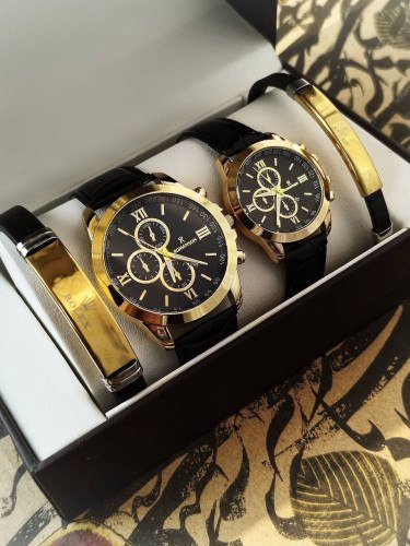 ✨ مجموعه ست ساعت زنانه و مردانه مارک رومانسون بند چرمی مشکی صفحه مشکی همراه دستبند ✨
