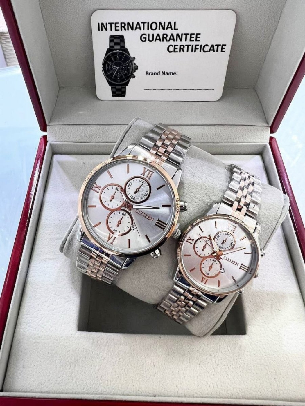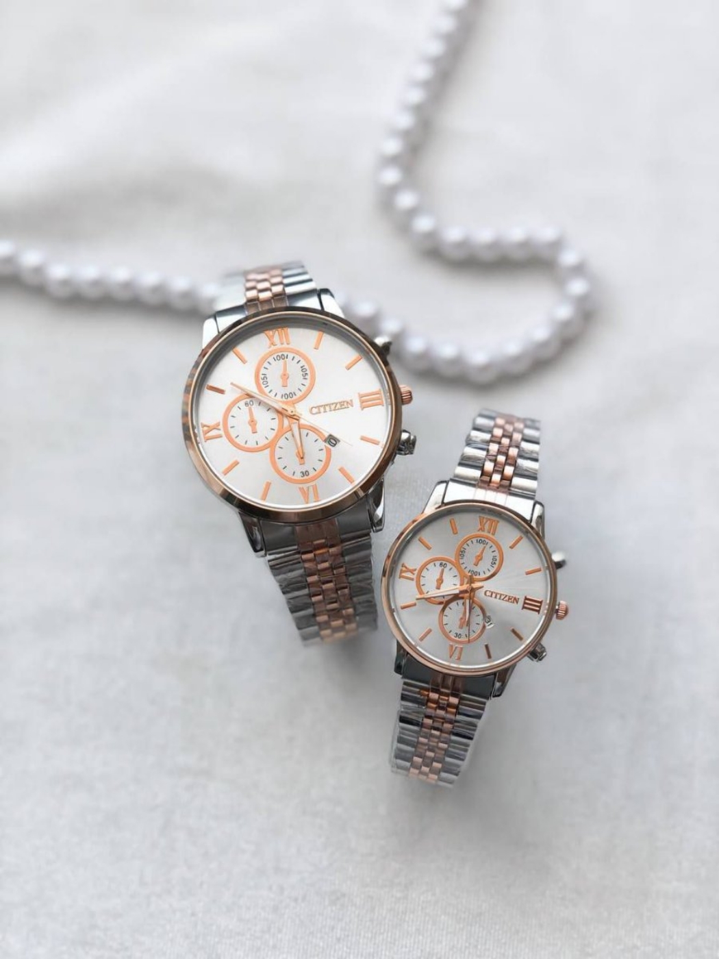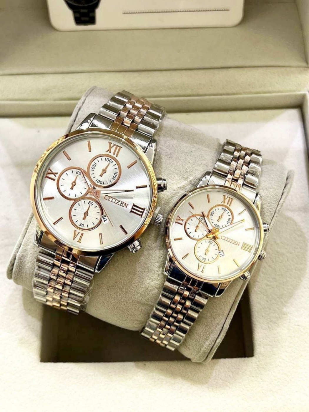 369303 ست ساعت زنانه و مردانه مارک سیتیزن بنداستیل دورنگ رزگلد صفحه نقره ای ✨طرح سه موتوره ✨دارای تقویم. کیفیت عالی. ✨شش ماه گارانتی موتور ✨ارسال با جعبه کادویی و کارت ضمانت ✨قطر شیشه ساعت مردانه 38 میلیمتر ✨قطر شیشه ساعت زنانه 28 میلیمتر
