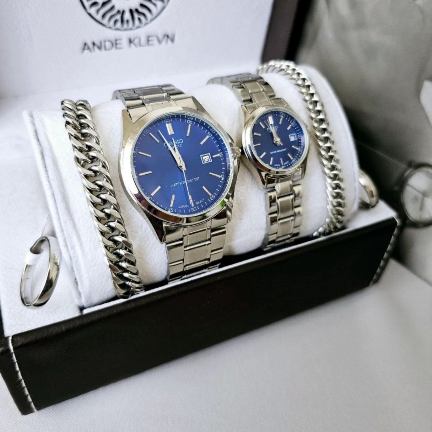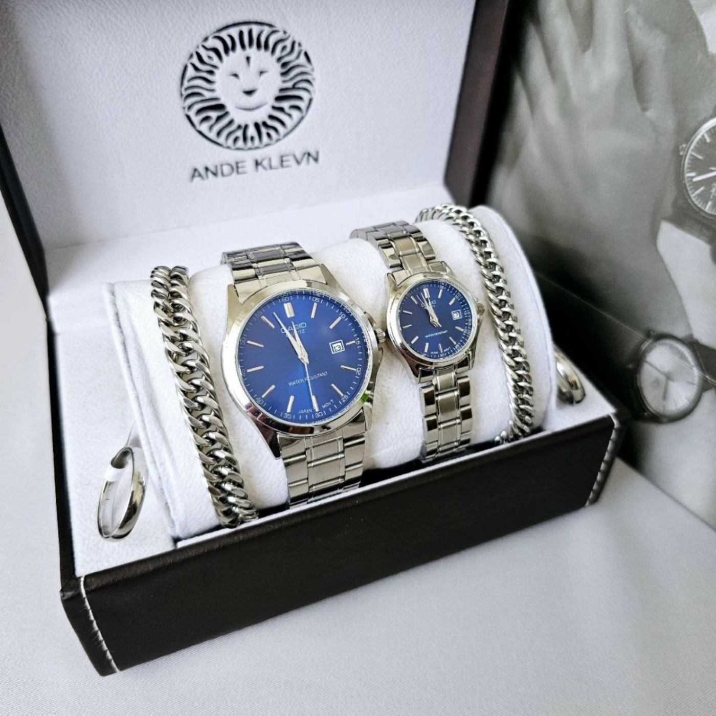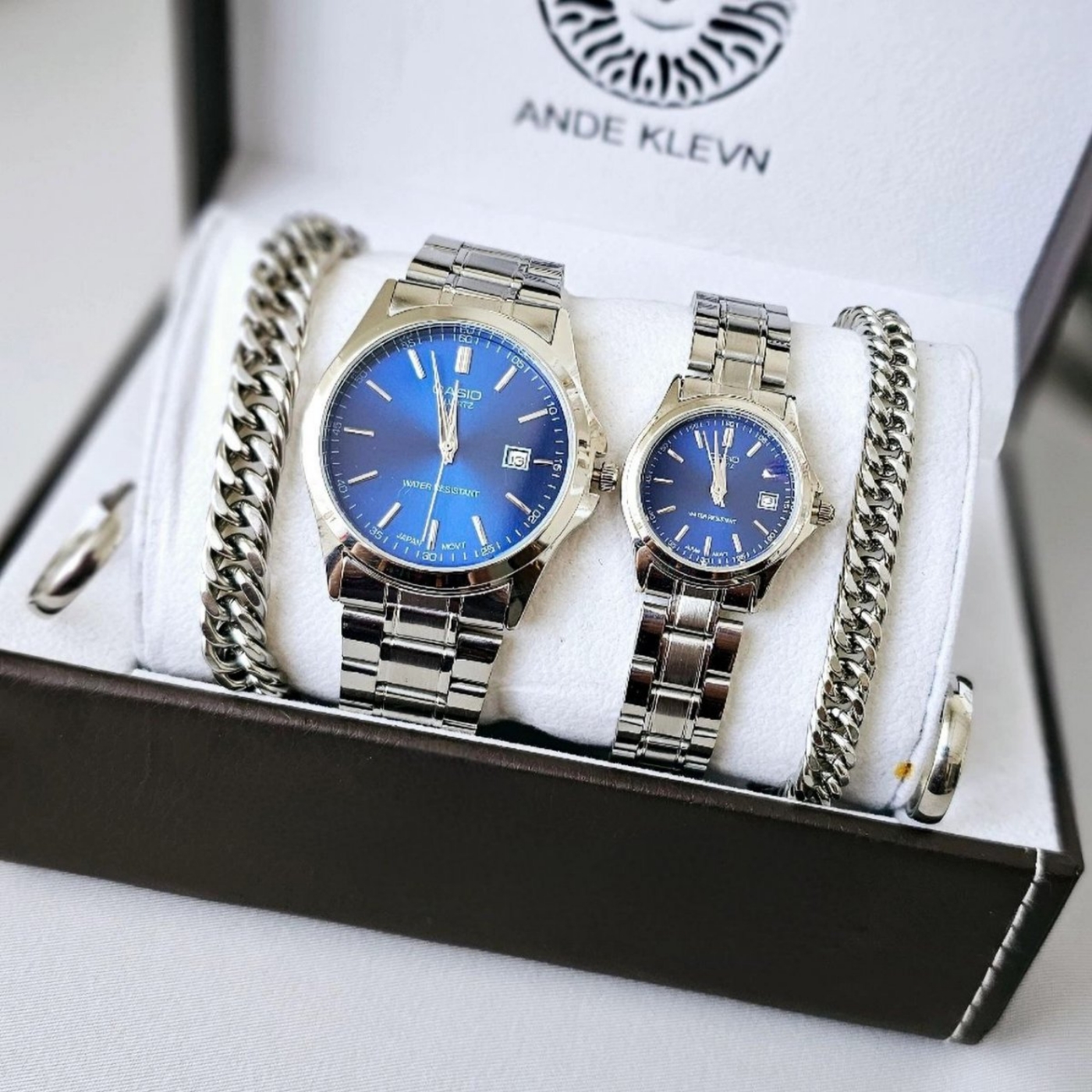 369603 ✨ ست ساعت کاسیو بند استیل نقره‌ای صفحه آبی + دستبند زنجیری استیل + حلقه ✨ 🔹 دارای تقویم | کیفیت عالی 🔹 6 ماه گارانتی موتور + کارت گارانتی تاریخ‌دار 🔹 وارداتی از دبی 🔹 ارسال با جعبه کادویی شیک 🎁 مناسب هدیه و جشن تولد