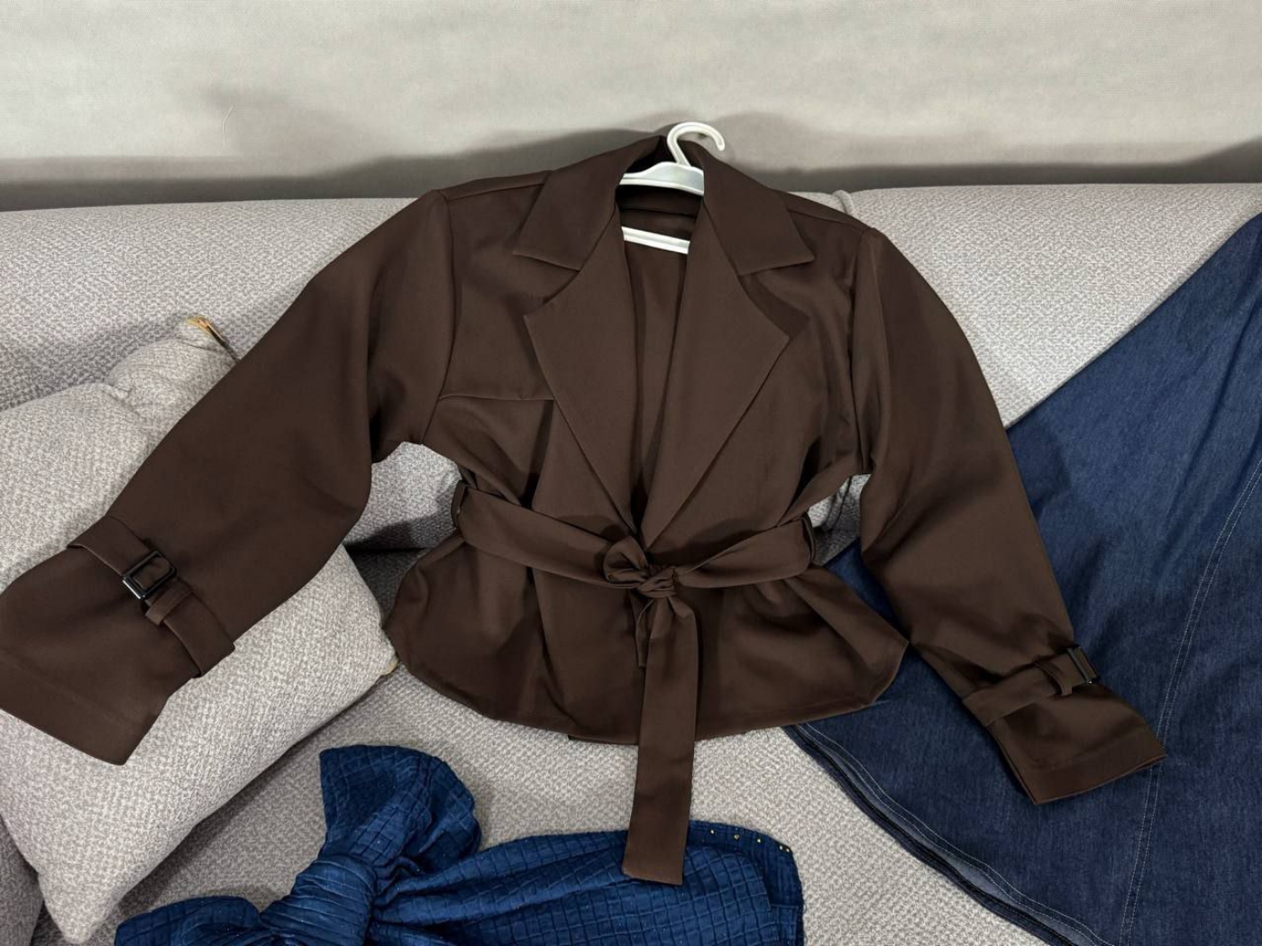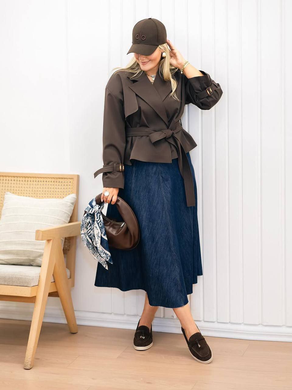 🧵جنس : جنس کت کرپ سوپر باربی درجه یک رنگ قهوه ای سوخته ترندی ،دامن جین پنبه درجه یک