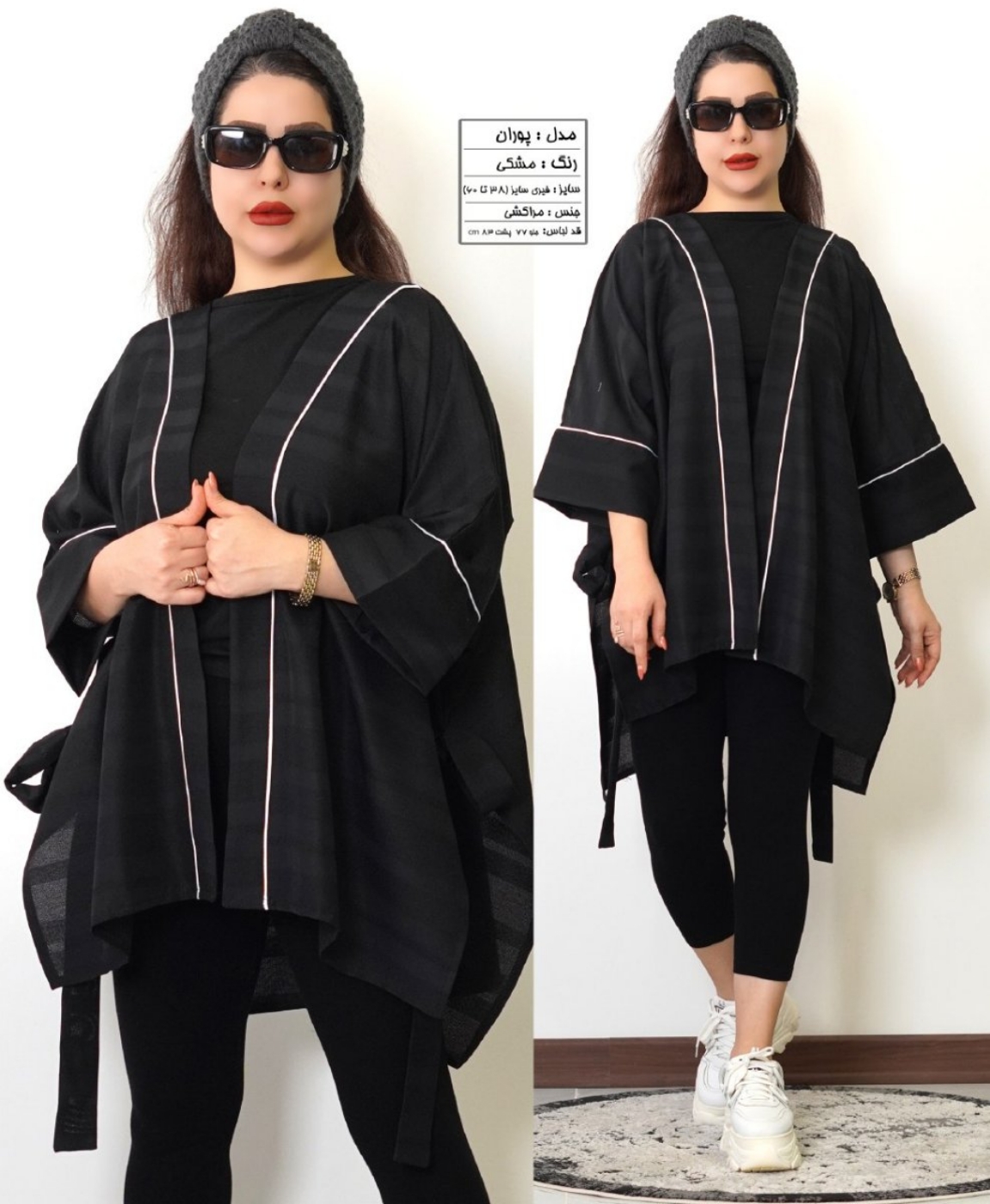 نام : پورانجنس : مراکشیرنگ بندی : سبز, سبز پسته ای, سفید, سورمه ای, کرم, مشکی, نسکافه ایسایز ها : فری سایز 38 تا 60 حدود قد : جلو 77 پشت 83