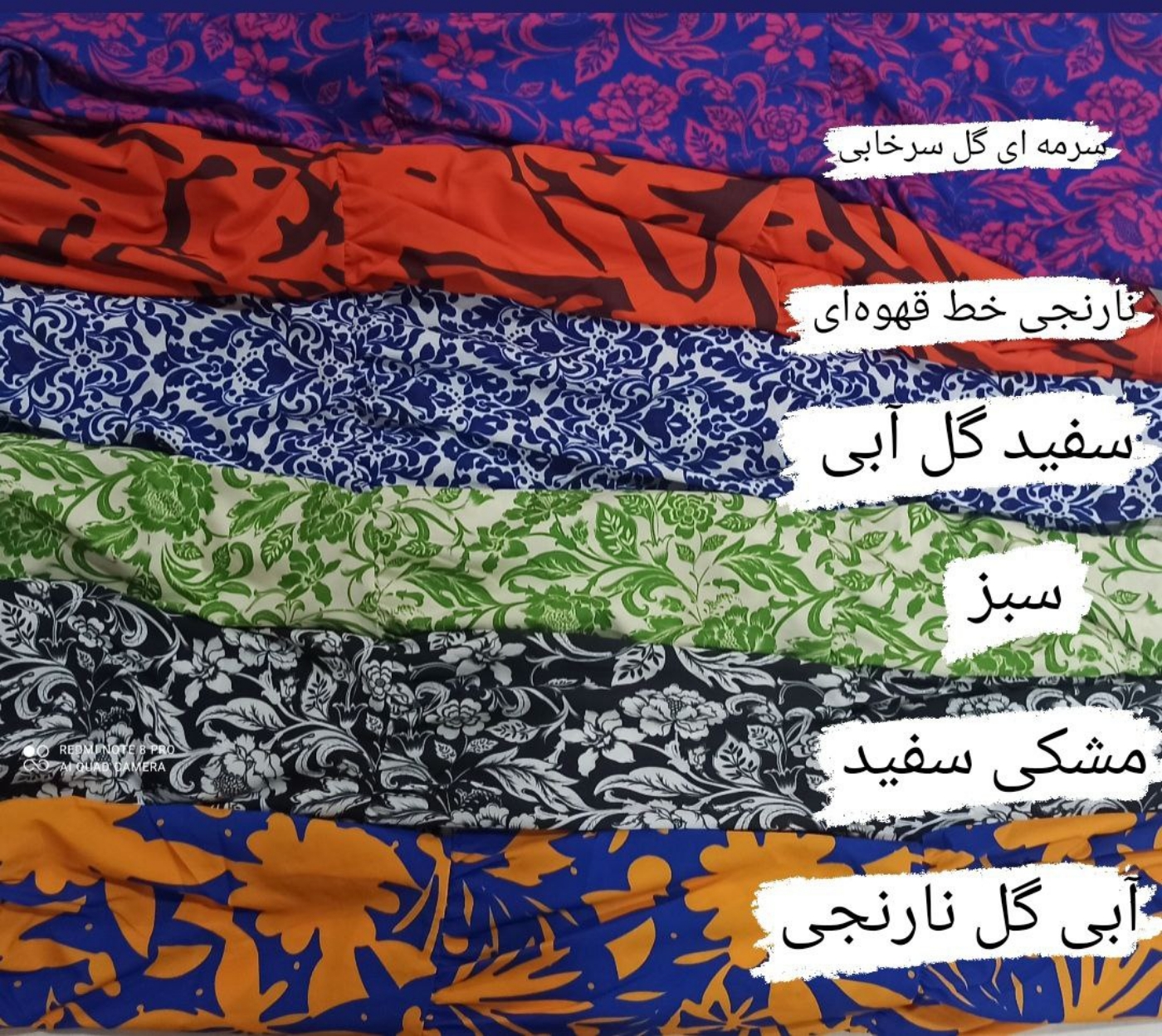 رنگ بندی : سرمه ای گل سرخابی، نارنجی خط قهوهای ، آبی سفید، سبز، مشکی سفید ، آبی گل نارنجی